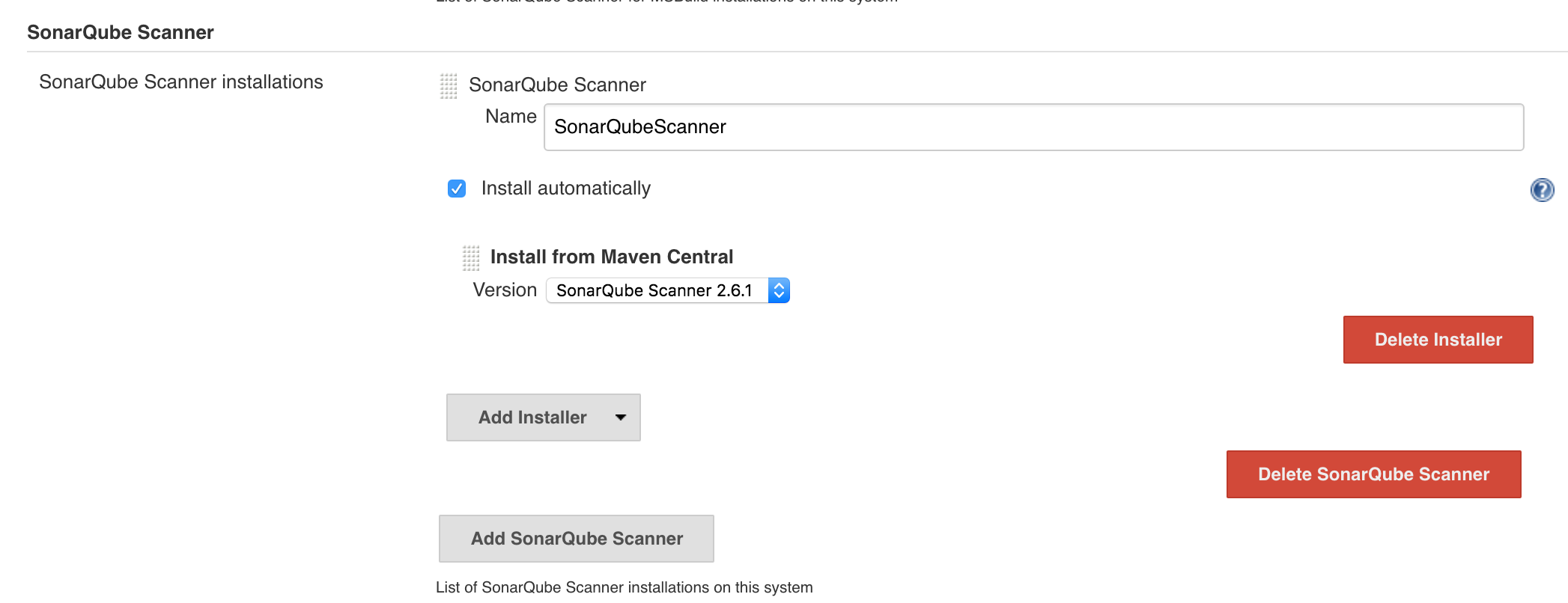 Jenkins 관리 -> Global Tool Configuration -> SonarQube Scanner -> Install automatically 체크, 최신버전 선택