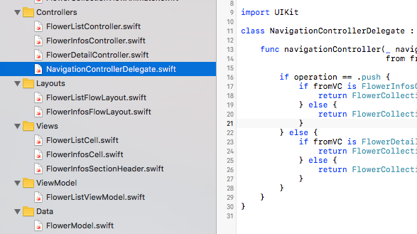 해당 앱은 NavigationController를 기반에 둔 화면 전환이기 때문에, 각각의 화면전환 시 에니메이션 지정이 필요 한 경우 NavigationControllerDelegate를 subClassing하여 Custom한 에니메이션을 지정할 수 있습니다.