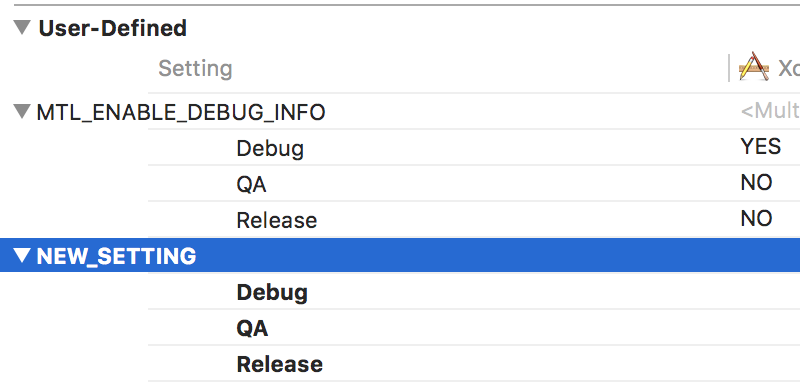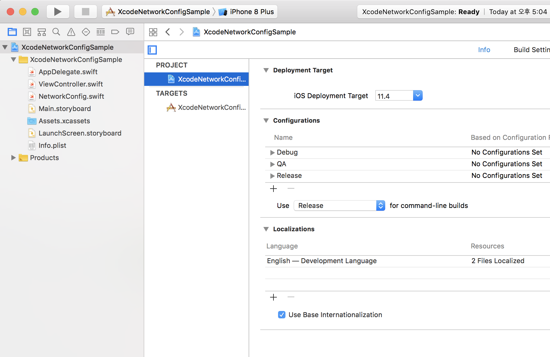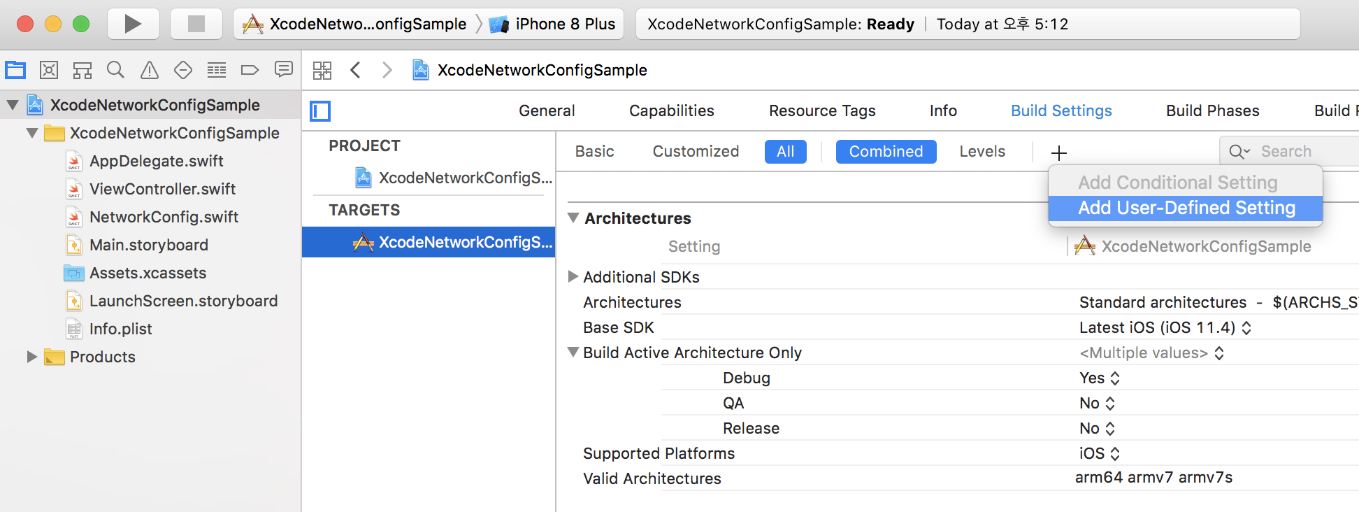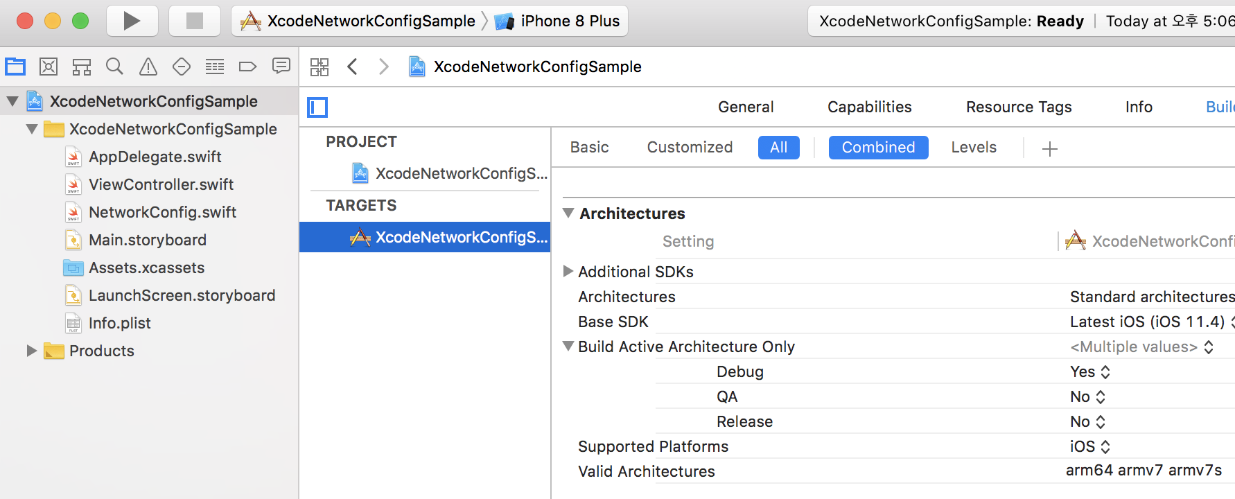 Target에의 Build Settings에 가보면 역시 QA 환경이 추가된 걸 확인 하실 수 있고요, 환경은 Release와 동일하게 구성돼 있는 것도 확인 가능합니다.