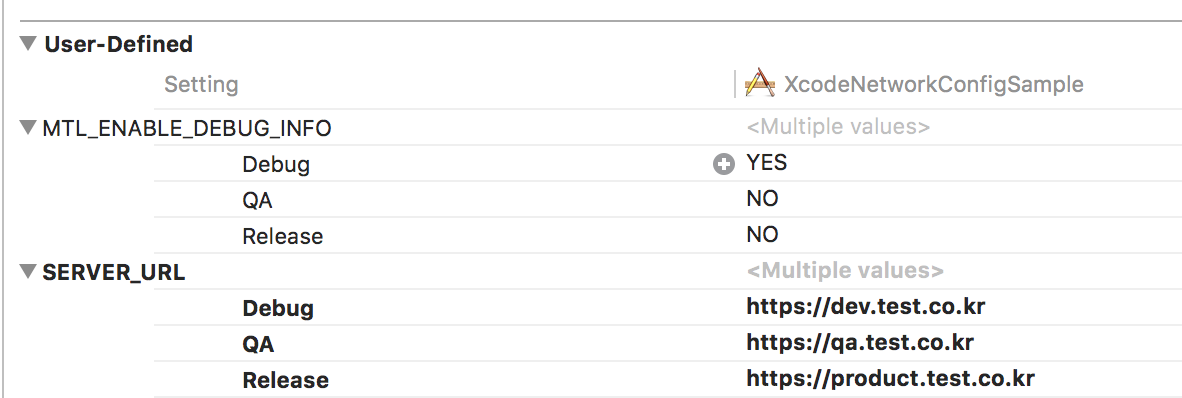 Xcode > Targets의 Build Settings에 각 서버 도메인을 기록해 둡니다. 서버 도메인이라는 필드는 기존 설정값에는 존재하지 않는 값 이기 때문에, 환경설정을 새로 추가하도록 하겠습니다.