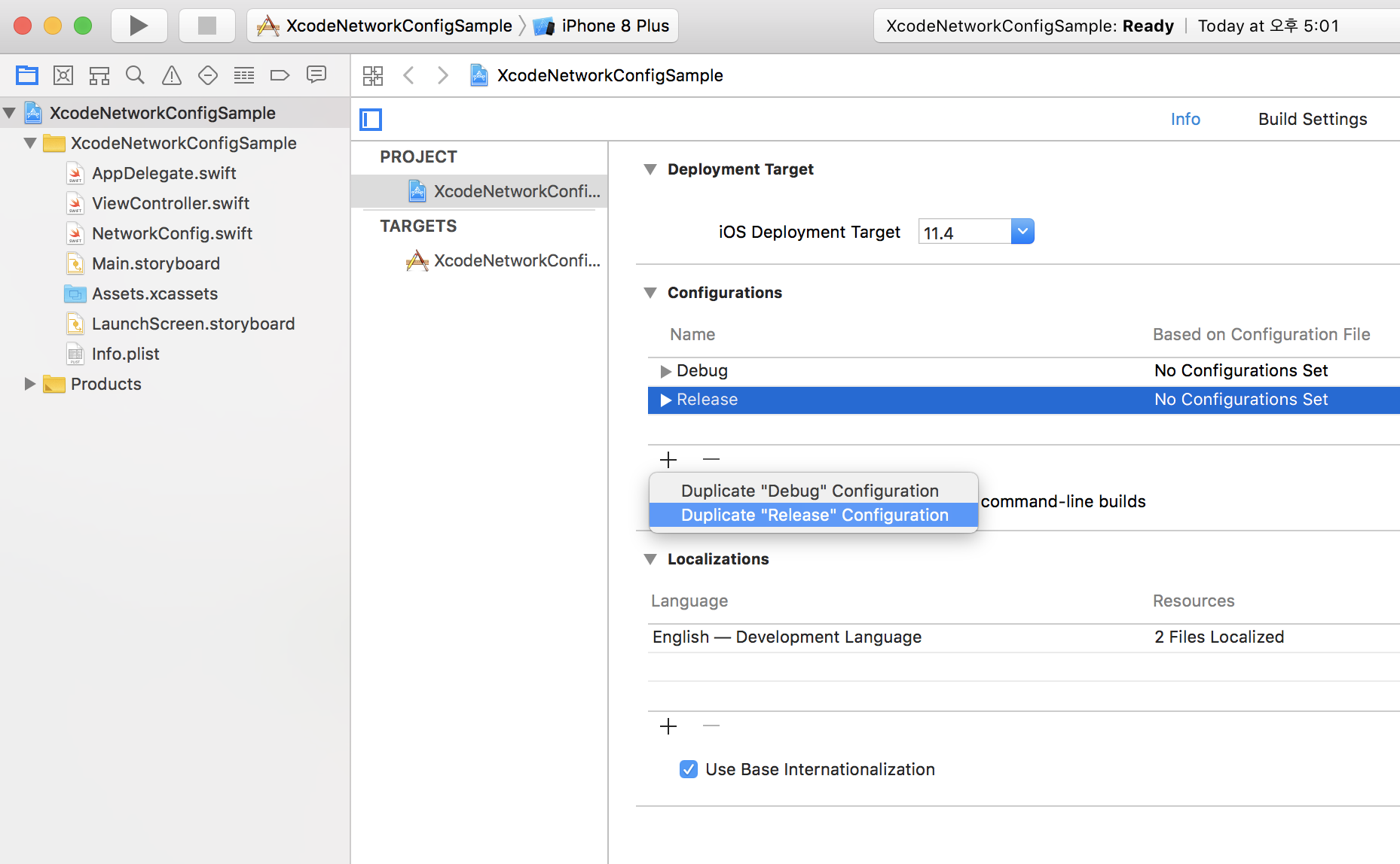 Project > Info에 가면 Configurations 항목이 있습니다. (기본 환경 설정은 Debug와 Release입니다.)