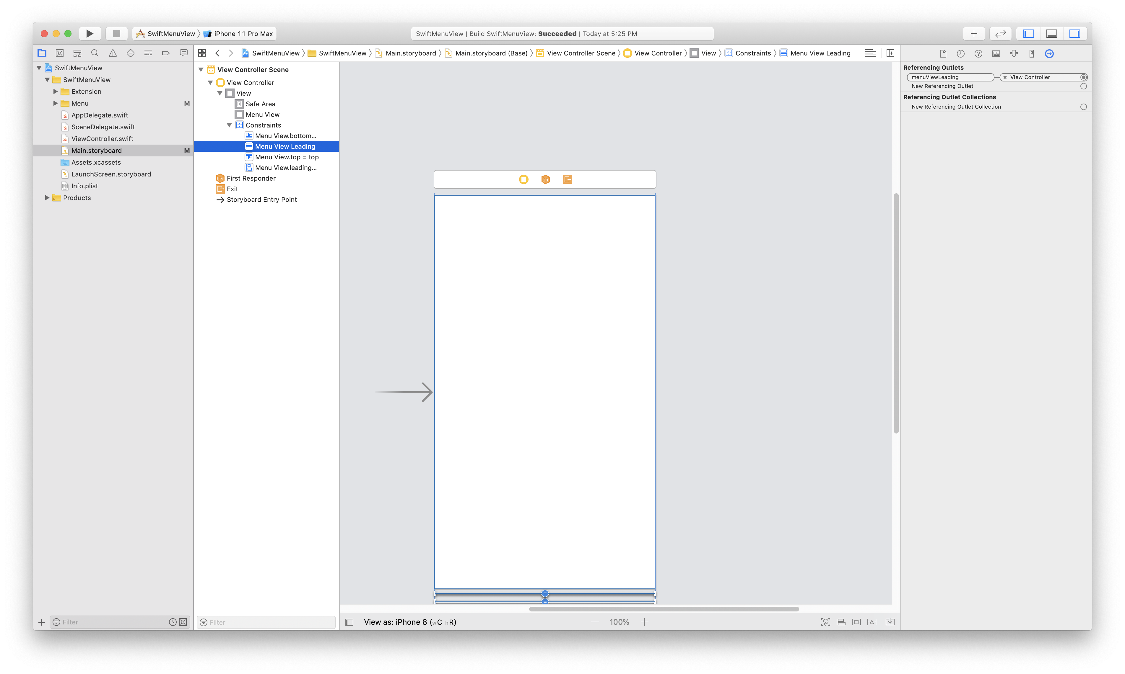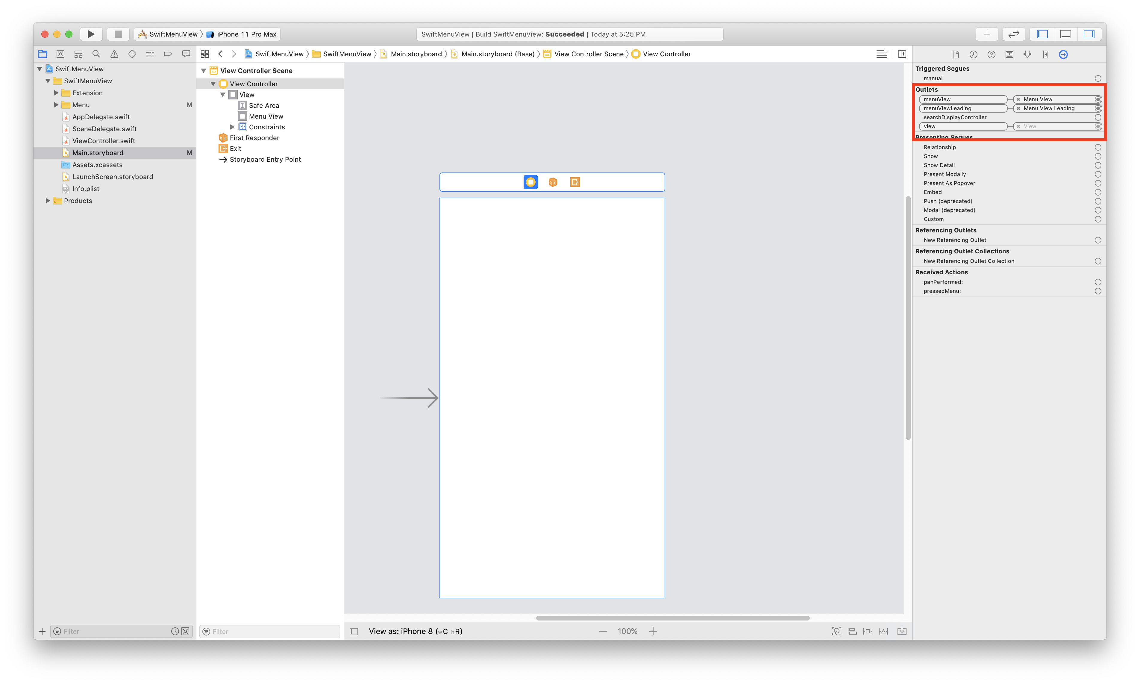 menuView및 menuViewLeading에 대한 Outlet을 설정합니다.