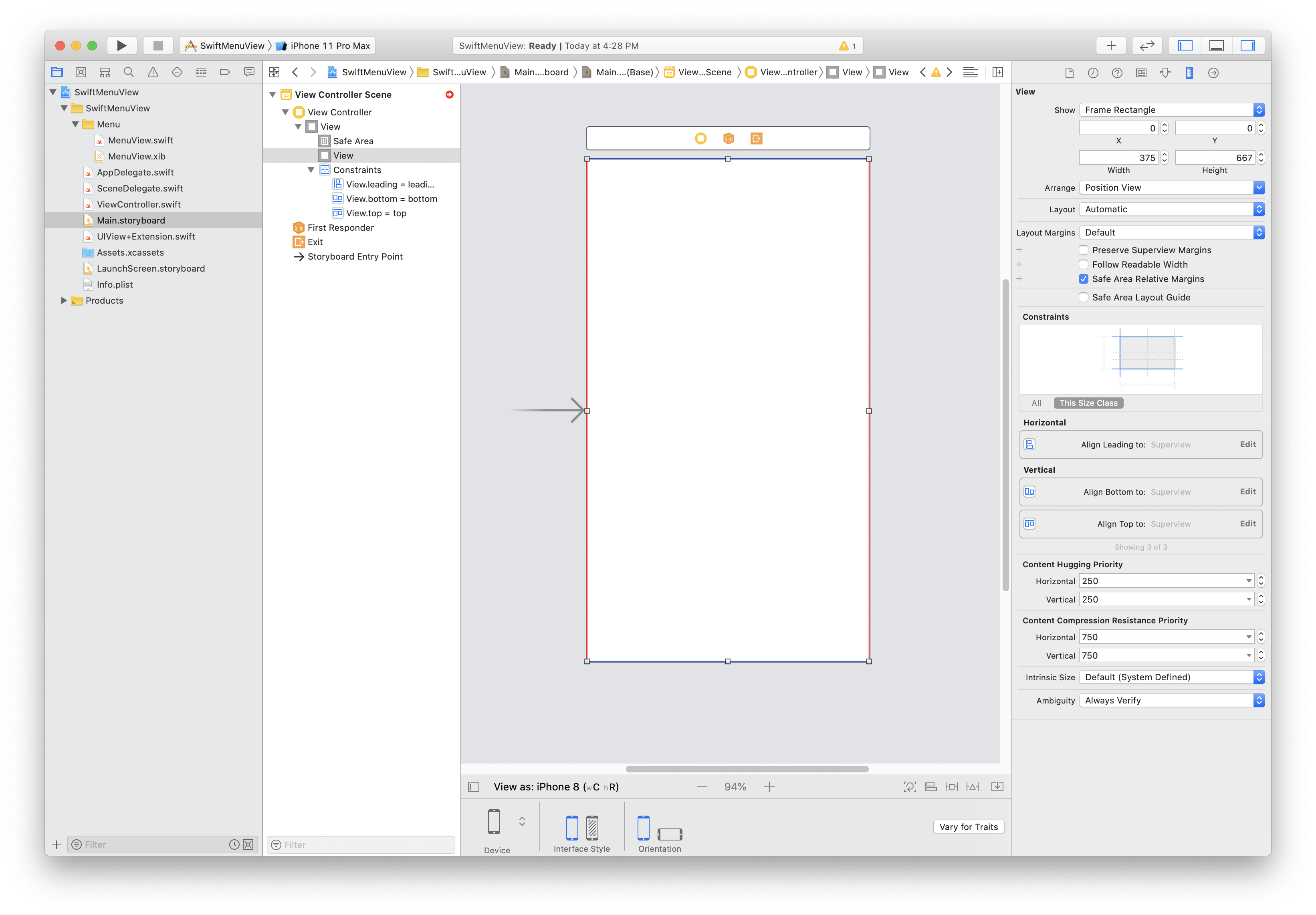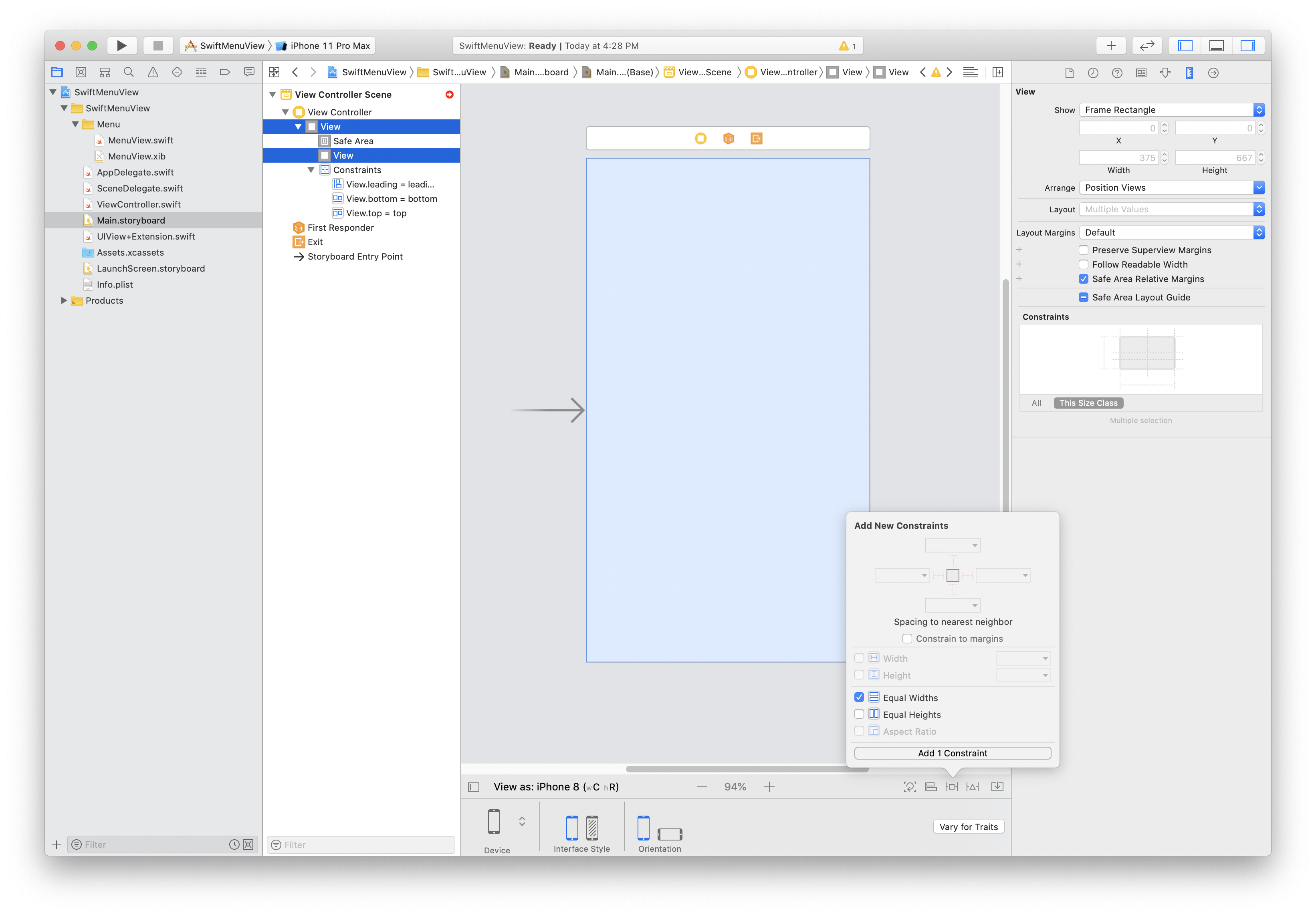 MenuView의 크기를 화면과 동일하도록 AutoLayout을 잡아줍니다.
