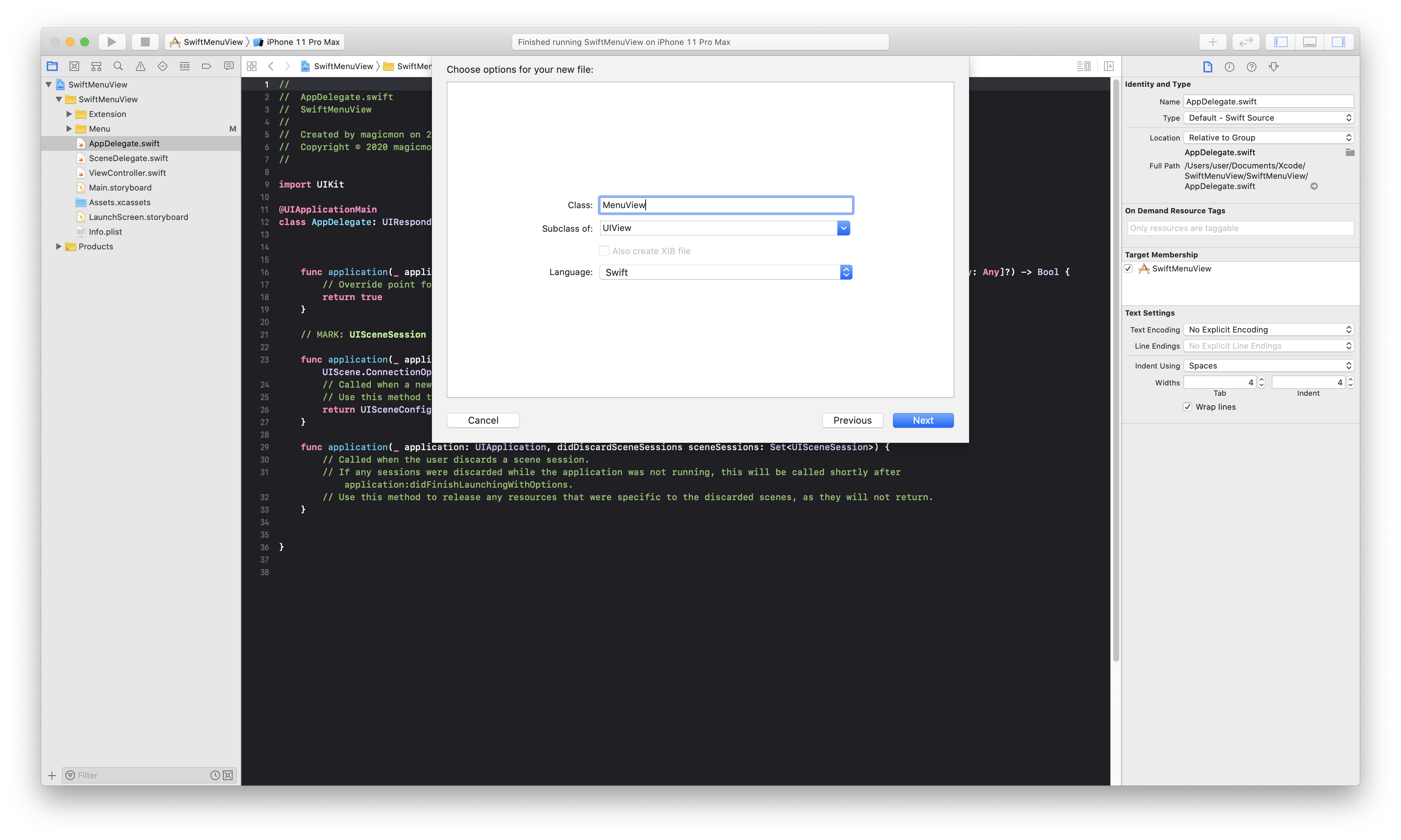 (여기서는 SwiftMenuView라는 이름으로 생성 하였습니다.)