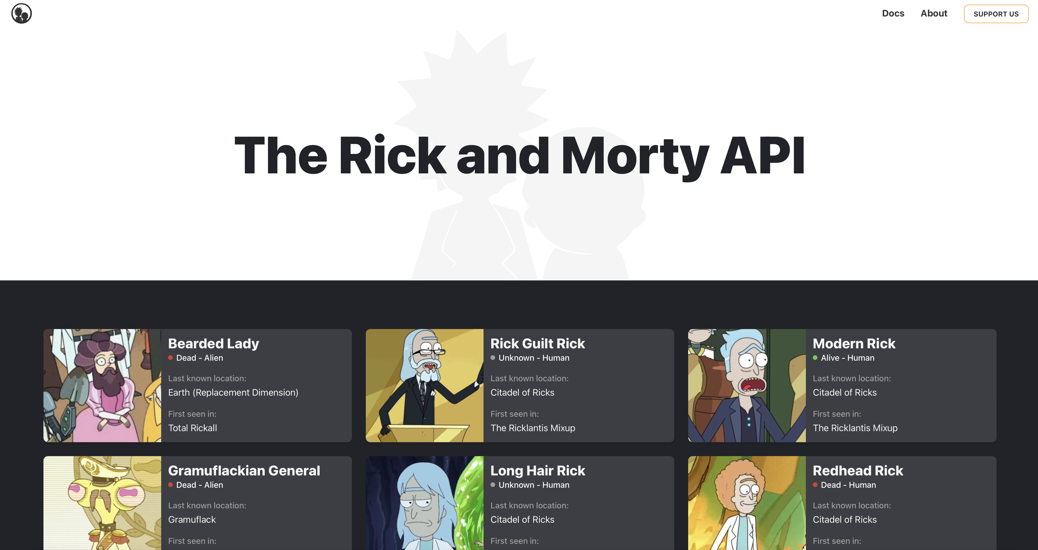 The Rick and Morty API is a REST and GraphQL API based on the television show Rick and Morty